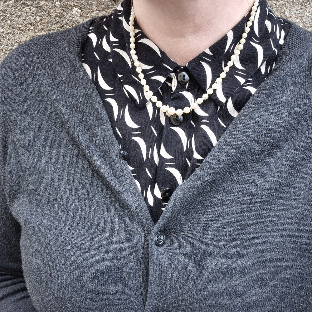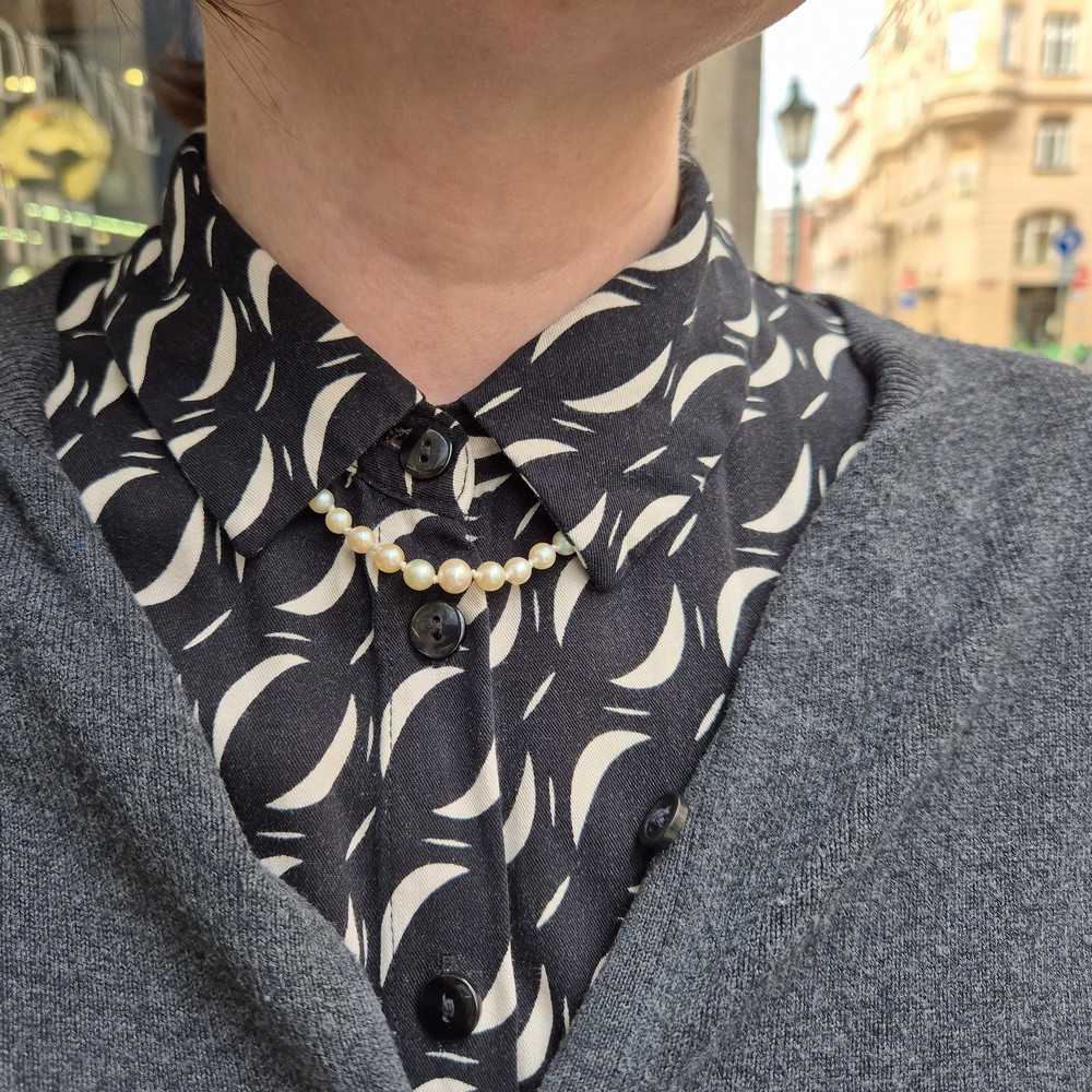 A strand of cultured freshwater pearls ranging in size from 3 mm to the largest pearl in the center, which measures 6.5 mm in diameter. The clasp is a 14k gold lobster clasp plated with rhodium, which has already worn off slightly. Stamped with the Czech state hallmark.