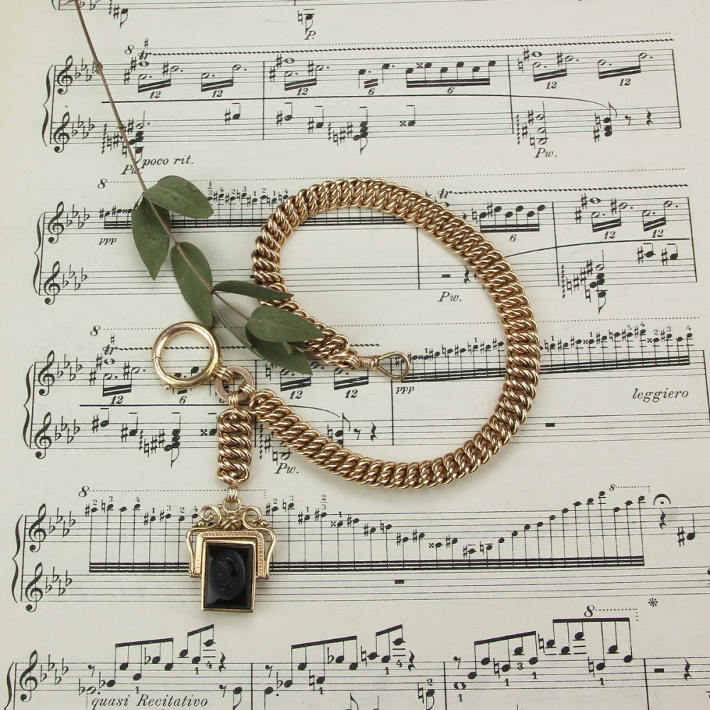 Gold pocket watch chain, made of 14k rose gold at the turn of the 19th and 20th centuries. Two natural carnelian plates are set in a rectangular pendant with a richly decorated frame. One of them depicts a cameo with a contemporary popular motif of a soldier with a helmet. The piece is marked with the Austro-Hungarian hallmark “fox” with the letter A (hallmarked in Vienna) and a less legible master mark, probably “SB”. The total length of the chain is 35 cm.
