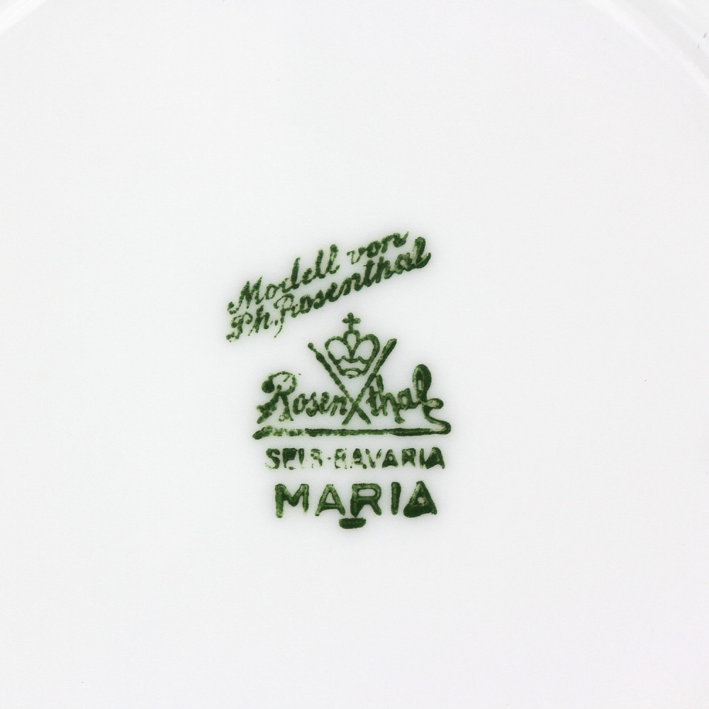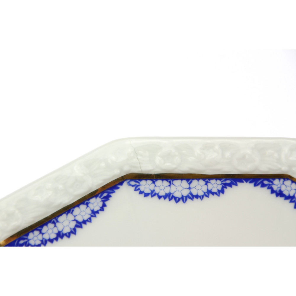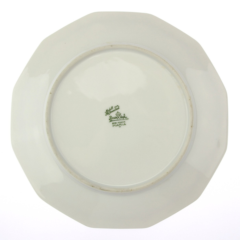 Set of six plates made by Rosenthal porcelain factory in Selb, Germany, Maria collection. Decorated with blue floral pattern and gilding. The polygonal rim of the plates is framed by an embossed pomegranate design.