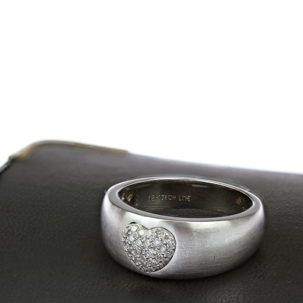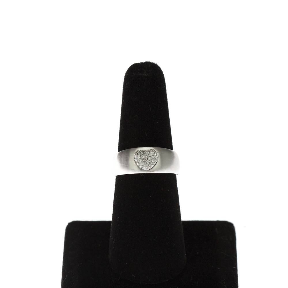 Ring made of white 18k gold, matt finish. In the centre is a raised heart motif set with natural round cut diamonds 30 × 0.005 ct (total 0.15 ct). The diamonds range in colour from G-H and achieve VS clarity.