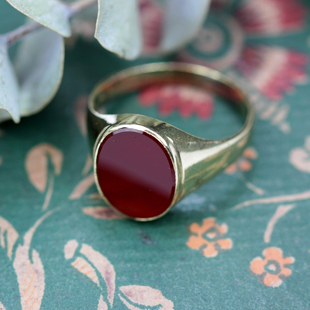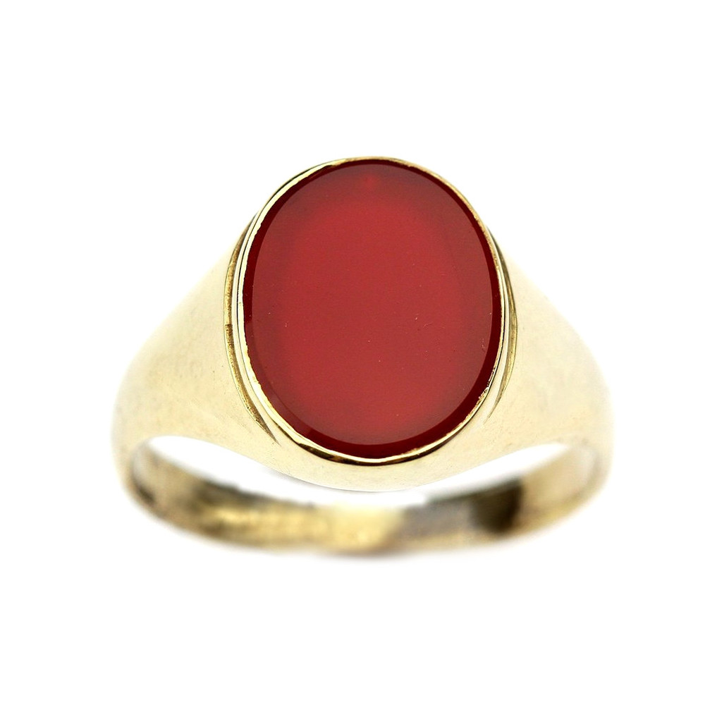 This men's ring made of 14k yellow gold with natural carnelian is marked with the fineness number "585," the state hallmark "čejka" (used between 1949 and 1992), and the mark "S2" (Soluna).
