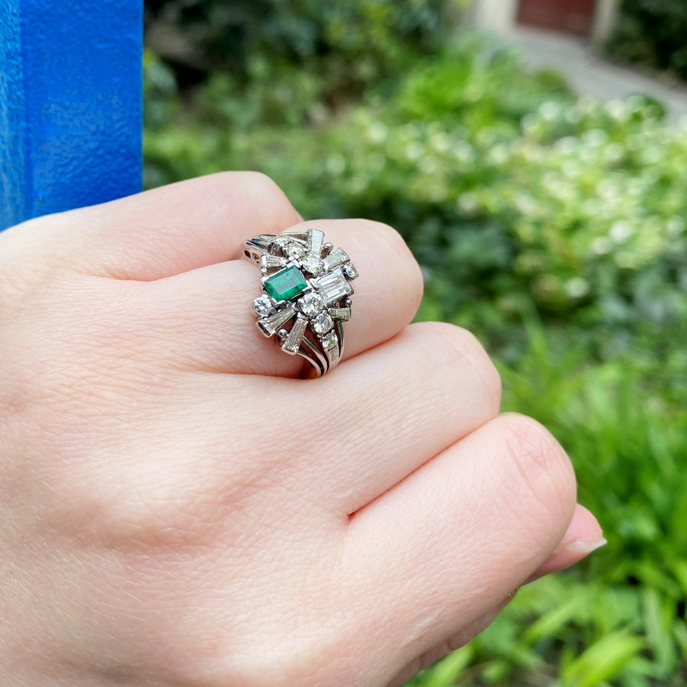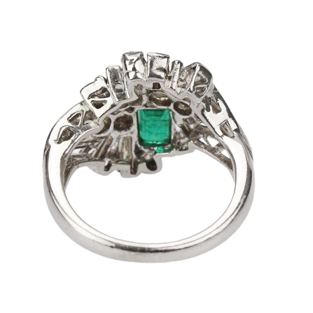 Ring crafted in the second half of the 20th century from sterling silver. The prominent setting is adorned with a natural emerald weighing 0.60 ct and natural diamonds in baguette and round cuts with a total weight of 1.185 ct.
