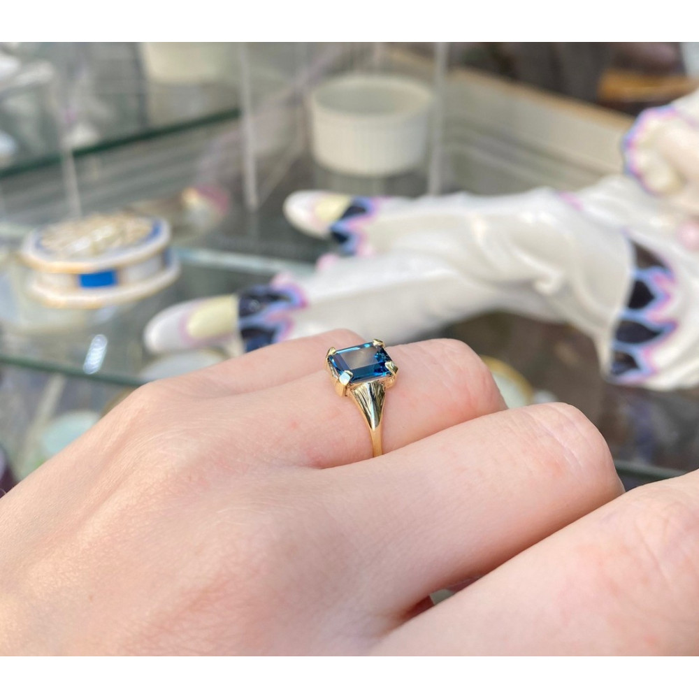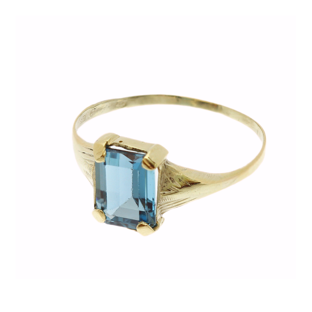 This delicate ring, crafted from 14k yellow gold, features a natural topaz weighing 1.85 ct set in the center. The ring is stamped with the Czechoslovak "lion" hallmark used between 1929 and 1949. The head and stone setting indicate a later modification and the replacement of the original stone.