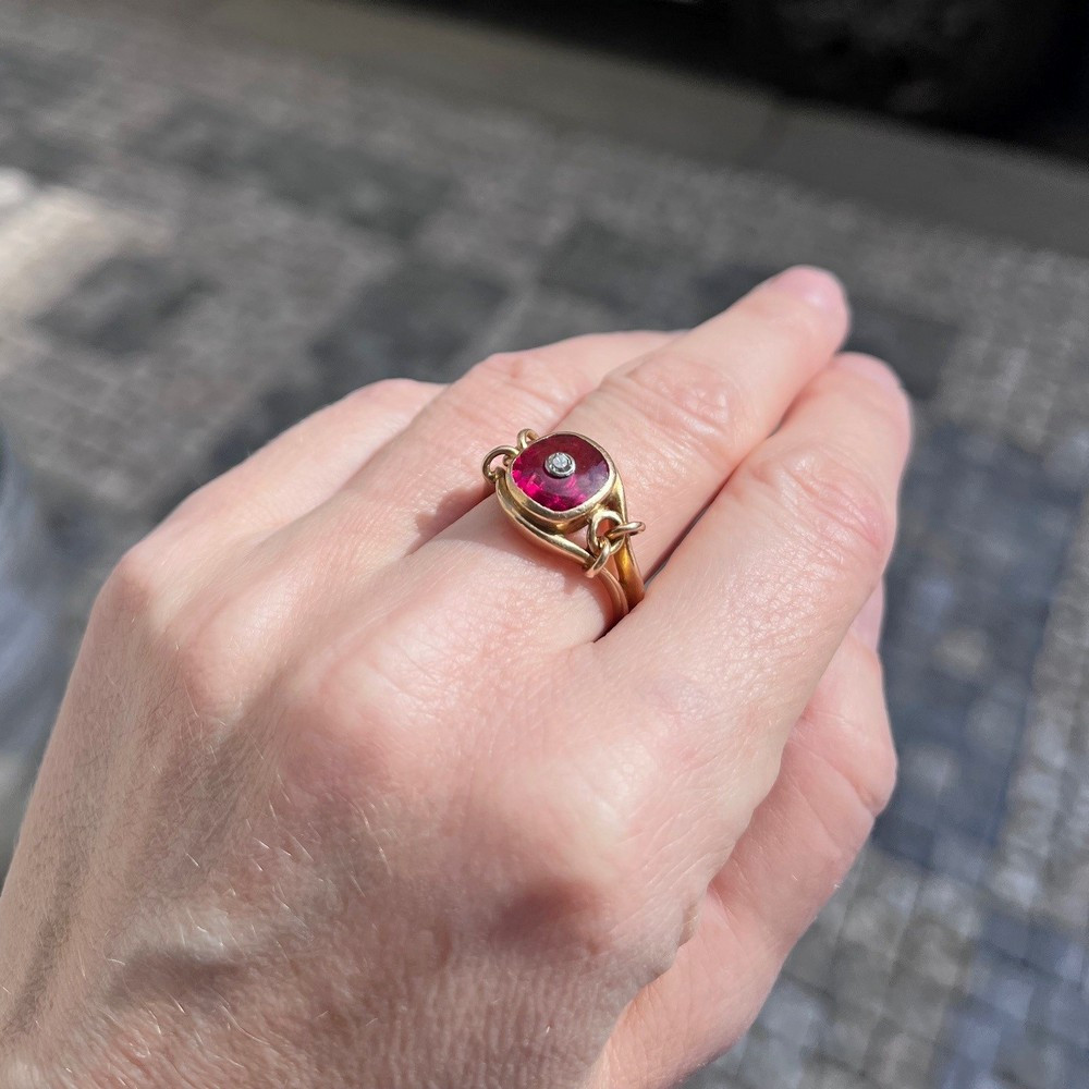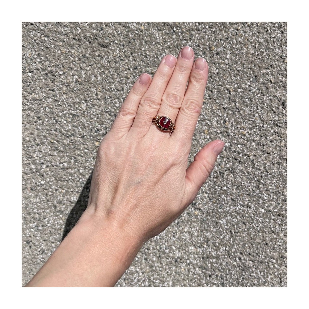 This Austro-Hungarian ring made of 14k rose gold is dominated by a synthetic ruby, in the center of which is set a natural, single cut diamond weighing 0.06 ct. The piece is stamped with an Austro-Hungarian hallmark and the letter "A," which refers to the Assay Office in Vienna, and the maker's mark "LS."