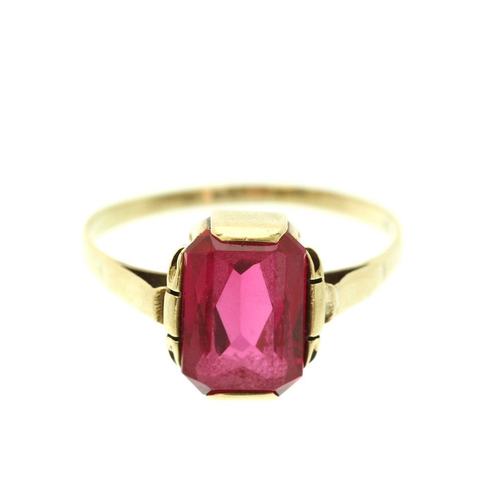 This 14k yellow gold ring with a synthetic ruby is stamped with the Czechoslovak "lion" hallmark used since 1929 and the fineness number "585".