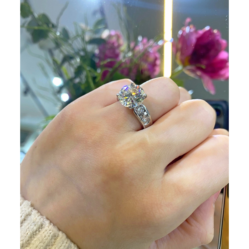 Luxury ring made of platinum with a set round cut diamond of 4.20 ct, colour J-K and clarity VS1. The shank is decorated with four diamonds weighing a total of 0.80 ct (4 × 0.17 ct - 0.22 ct; colour F-G; clarity VS1) and four baguette-cut diamonds weighing a total of 0.05 ct (4 × 0.01 ct; colour F-G, clarity VVS-VS1). The ring is certified by the top laboratory HRD based in Antwerp.