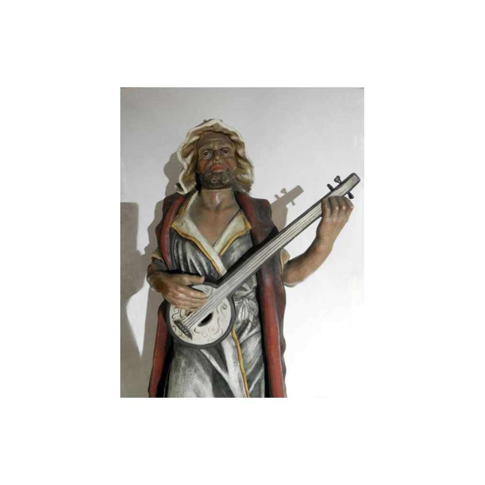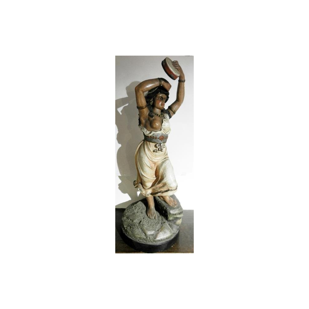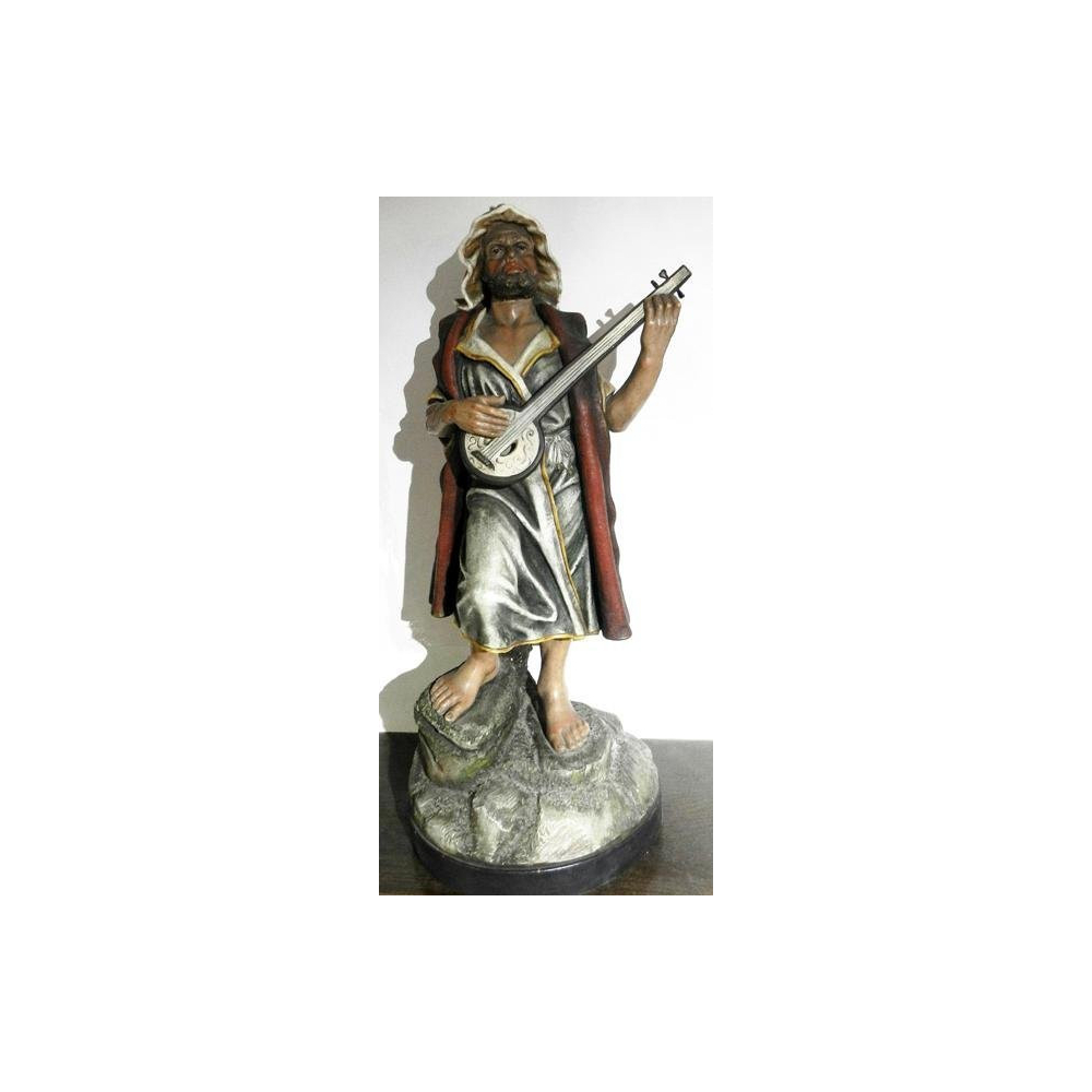 Two large (72 cm) paired statues of musicians made of polychrome ceramic. Probably made in the siderolith ceramics factory of Johann Maresch and his son Ferdinand (official name Johann Maresch Thon- und Stein- gutwaren fabric in Aussig or Johann Maresch Siderolith und Terracotta Fabrik), which was located in Ústí nad Labem. Unmarked.