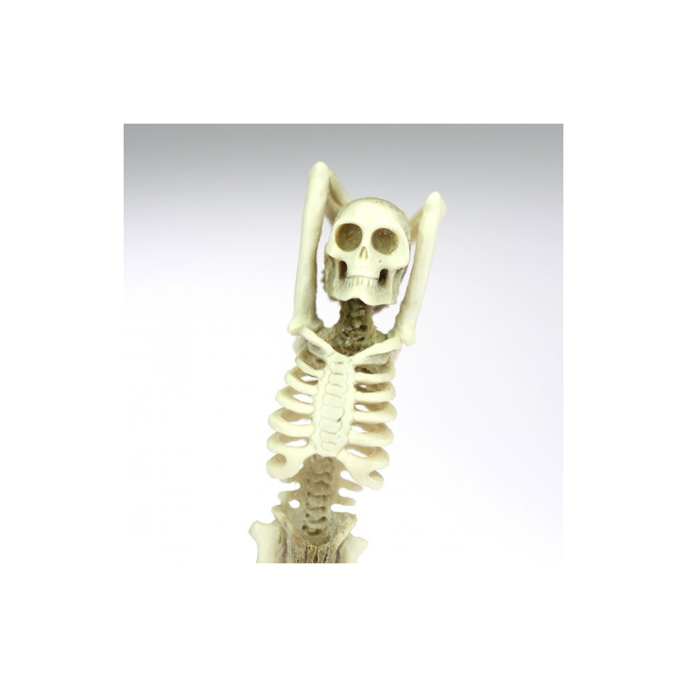 Carved figure of a skeleton with a hat made of horn mounted on a wooden base.