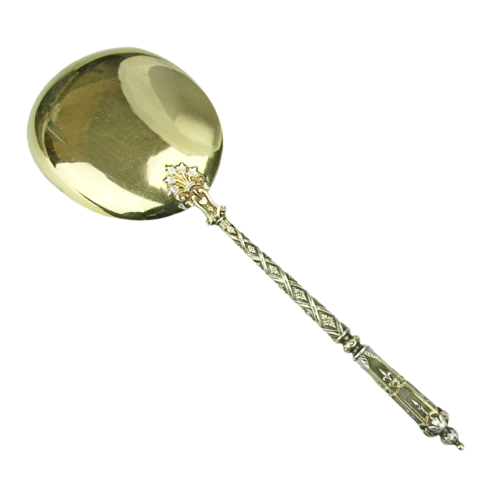 A richly decorated silver ice cream serving spoon in its original case. The spoon is made of silver, with the handle featuring ornamental relief work and the bowl engraved with a motif of flowers, a bird, and a butterfly. Partly gilded. The item originates from the Parisian workshop of Henri Gabert, which was active between 1882 and 1901.