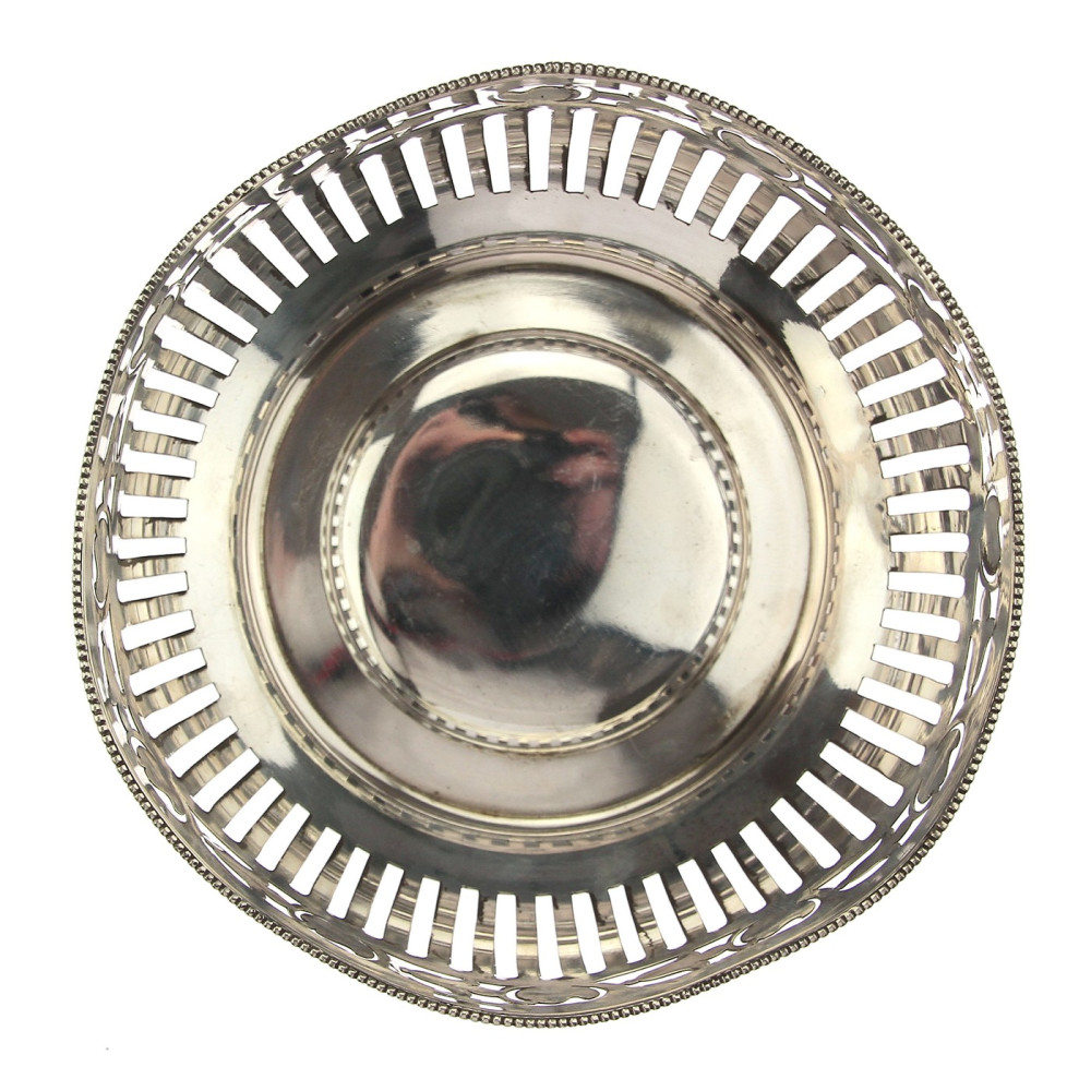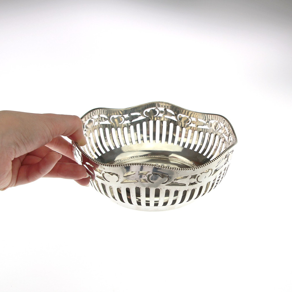 Silver bowl with an openwork ribbing and rim with floral decoration. The object is marked with the Austrian "toucan" hallmark used since 1922. There are also the Czech "hare" hallmark, master and purity marks.