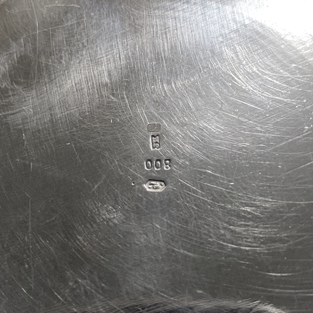 Oval tray made of silver ( fineness Ag 800/1000). Marked with Austrian hallmark "toucan" used since 1922, Czech hallmark "hare", master mark "EJ" and a fineness mark. The rim is decorated with embossed floral decoration.