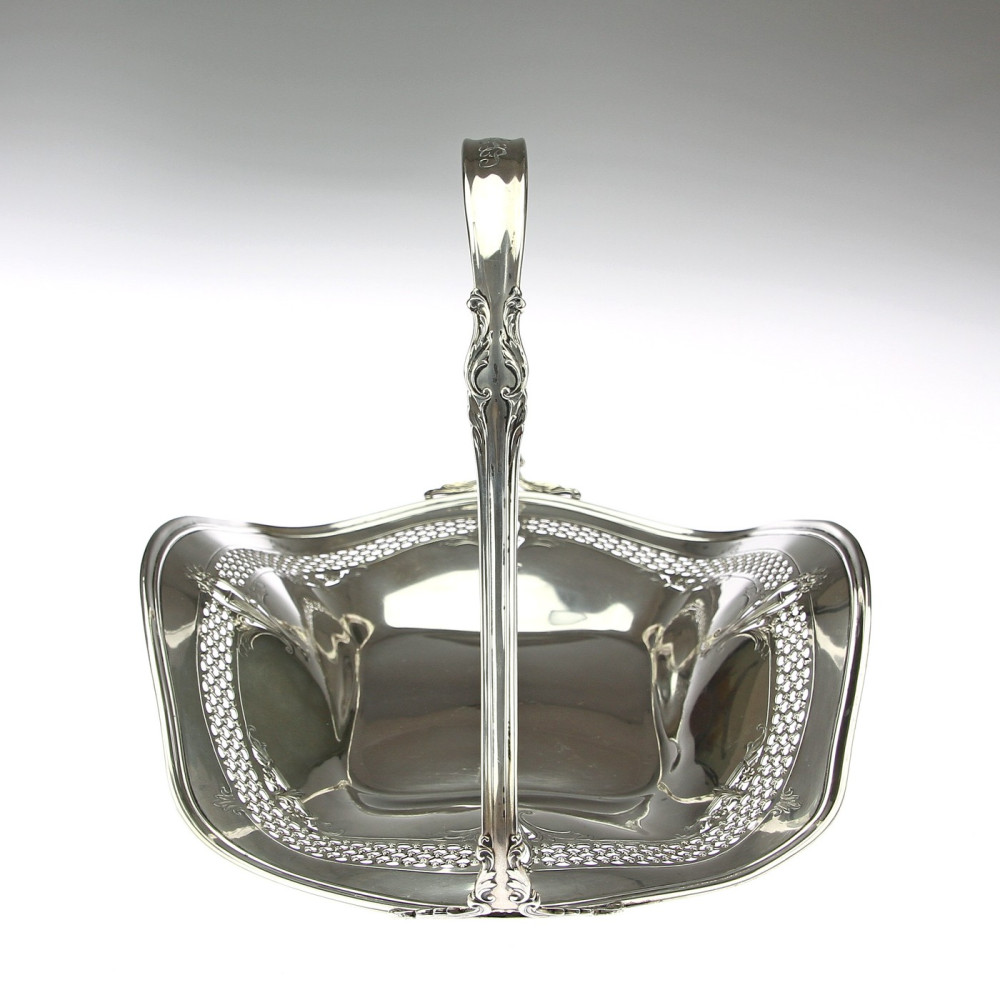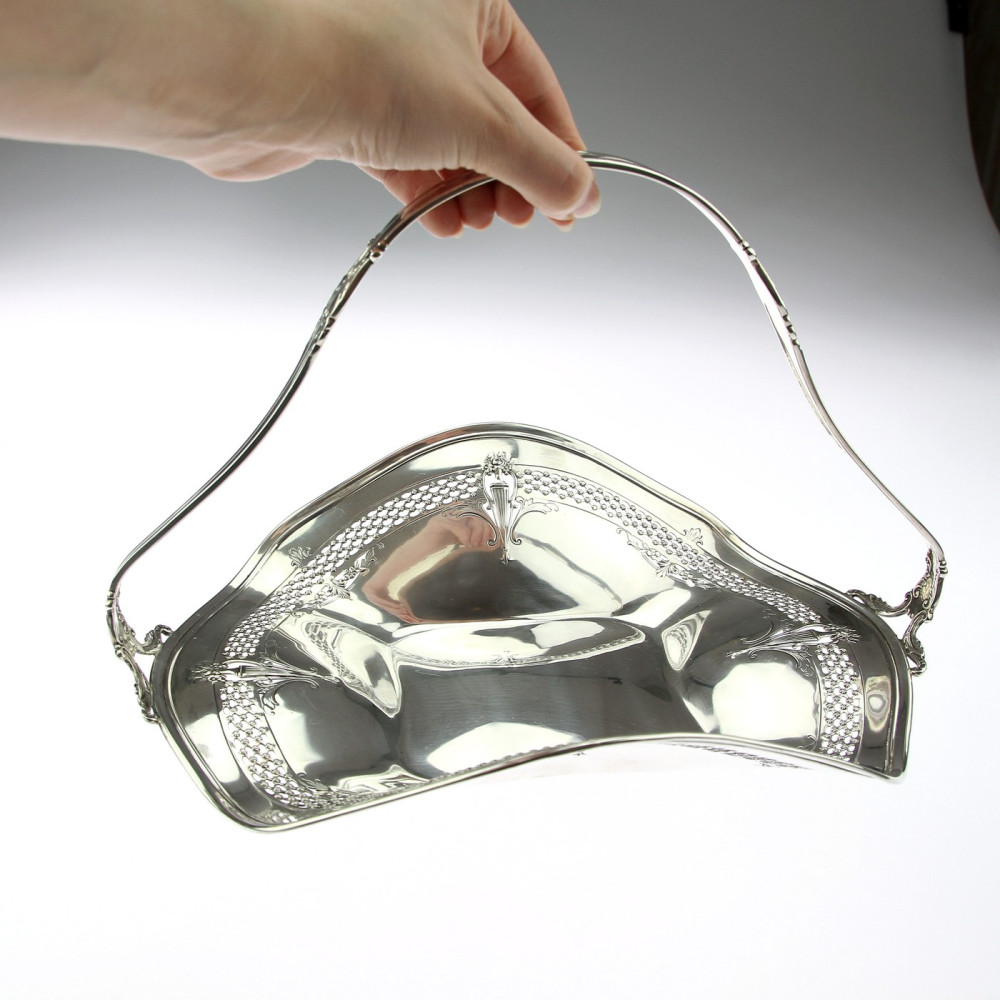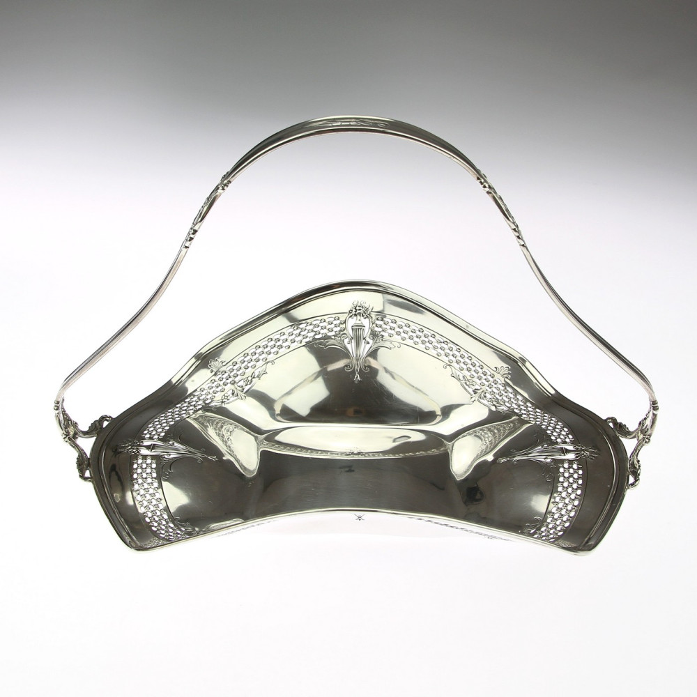 Basket made of silver of higher purity (Ag 925/1000) with decorative perforated band around the rim, complemented by Art Nouveau decoration in the form of vases with flowers and acanthus leaves. The handle is engraved with the monogram "MTP". The basket was made in the USA in the 1920s-1940s.