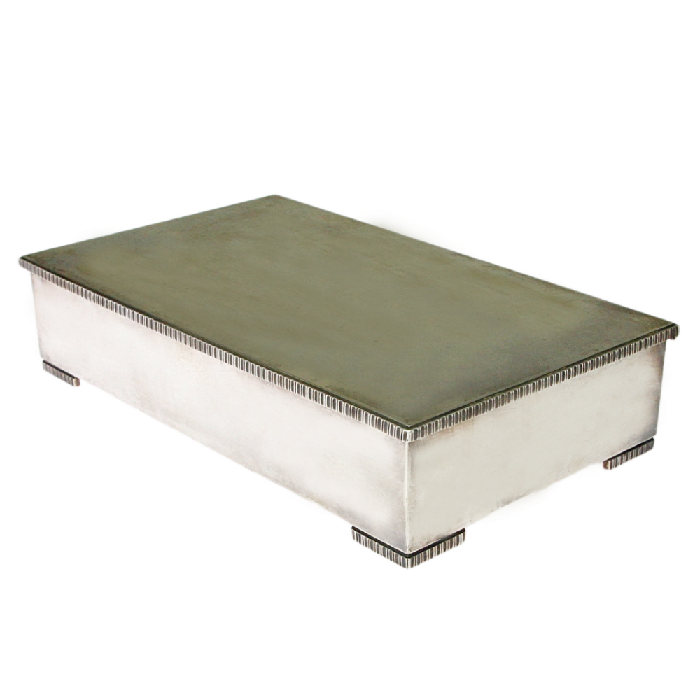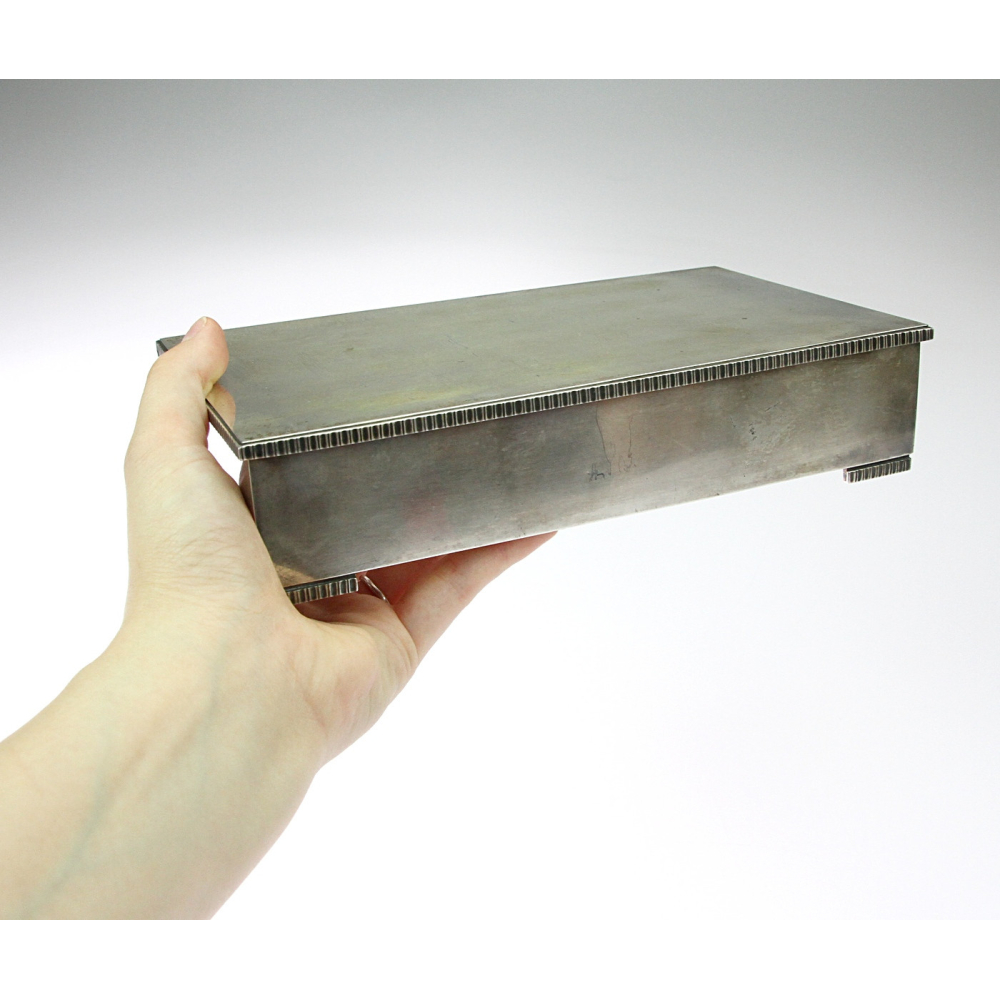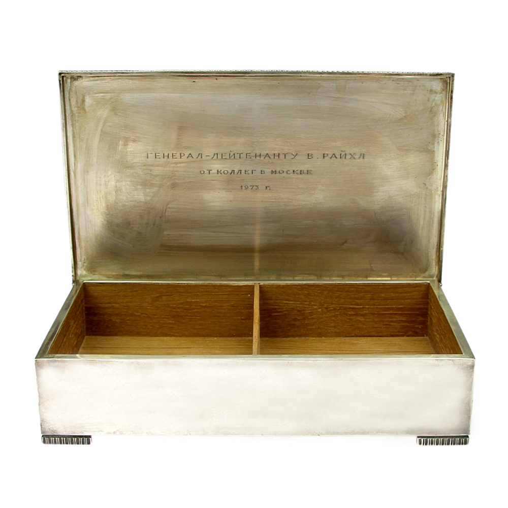 Solid silver box with wooden lining made by W. A. Bolin, one of the oldest silversmith companies in Sweden (founded in 1796) operating to this day. Dedication on the lid in Cyrillic: "General V. Raichl from colleagues in Moscow, 1973".