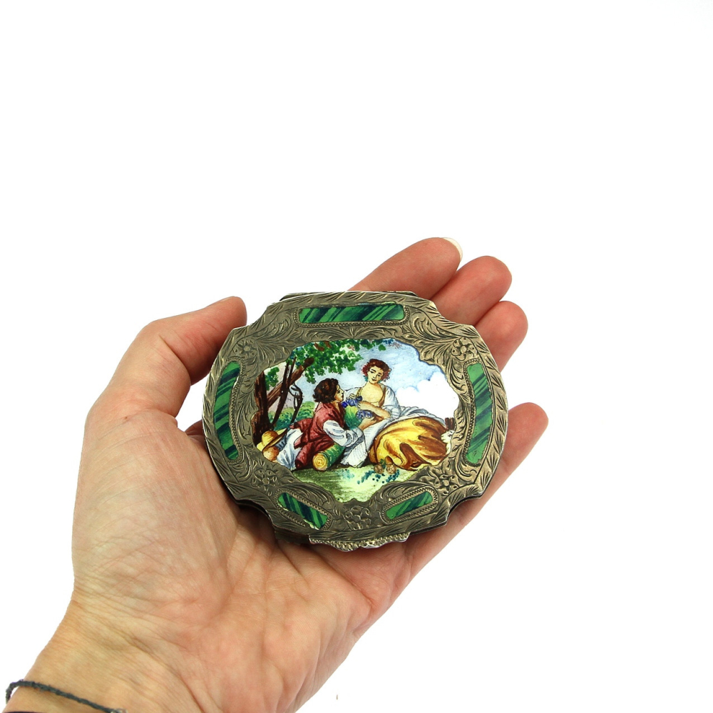 Silver box / originally a powder box with a mirror decorated with hand engraving and enamels depicting a love scene.