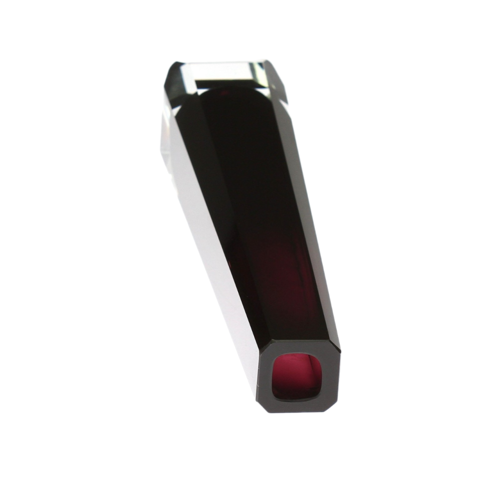 Conical, quadrilateral bud vase with cut corners combines clear and dark purple glass. Its design corresponds to the time period of the second half of the 20th century.