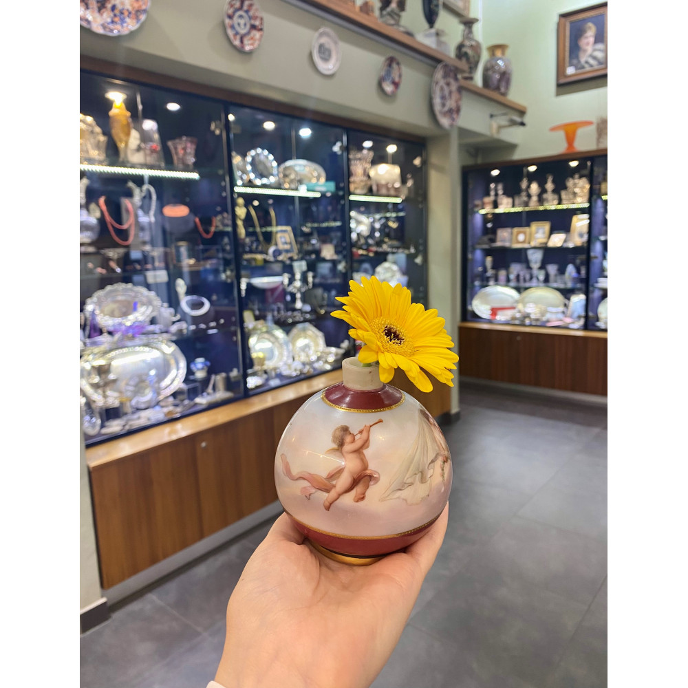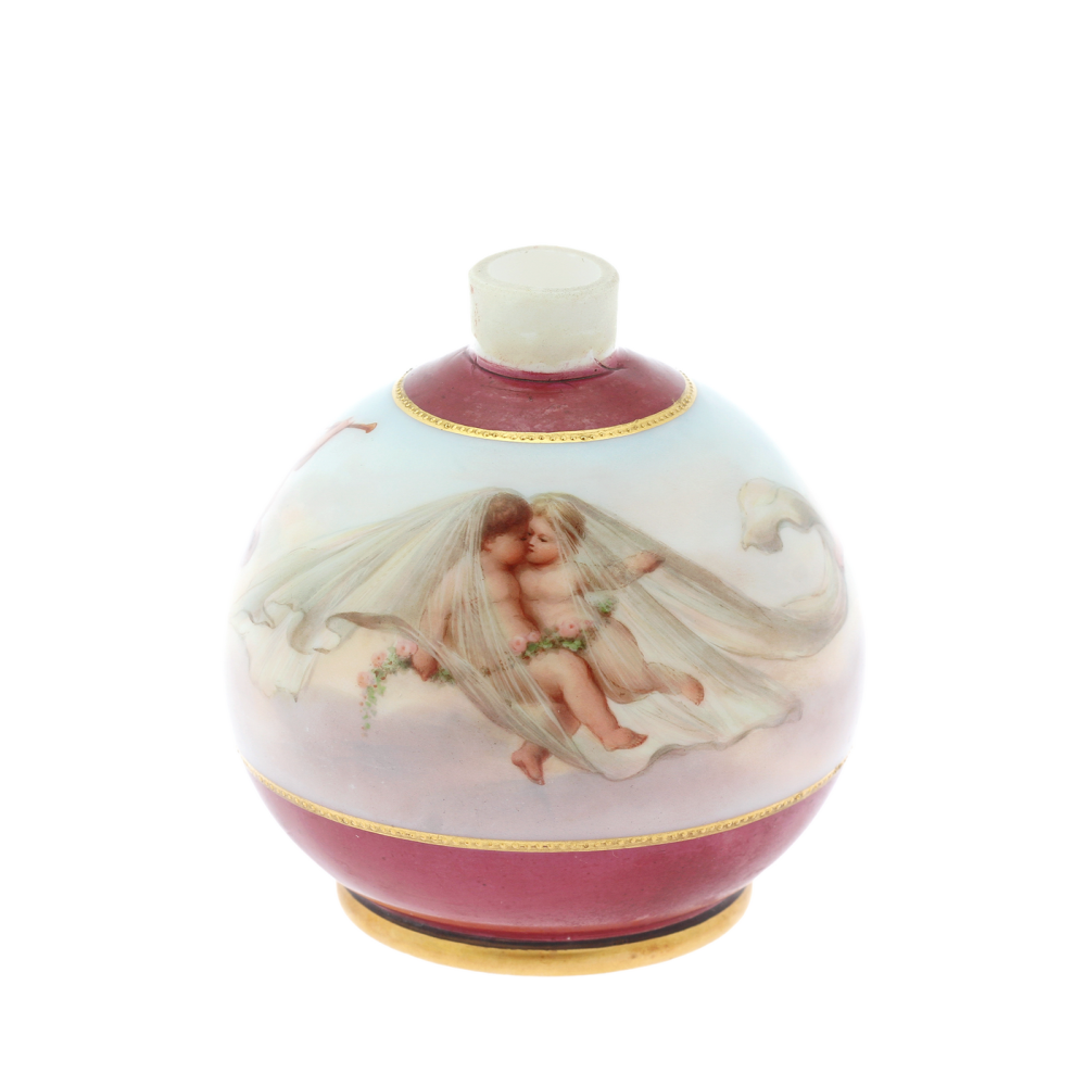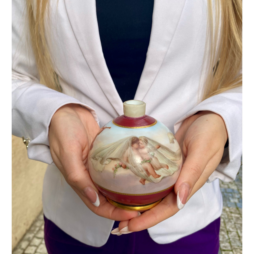 Small vase made of milk glass, hand-painted with a motif of cherubs, known as putti. Its design corresponds to European artistic trends of the last third of the 19th century.