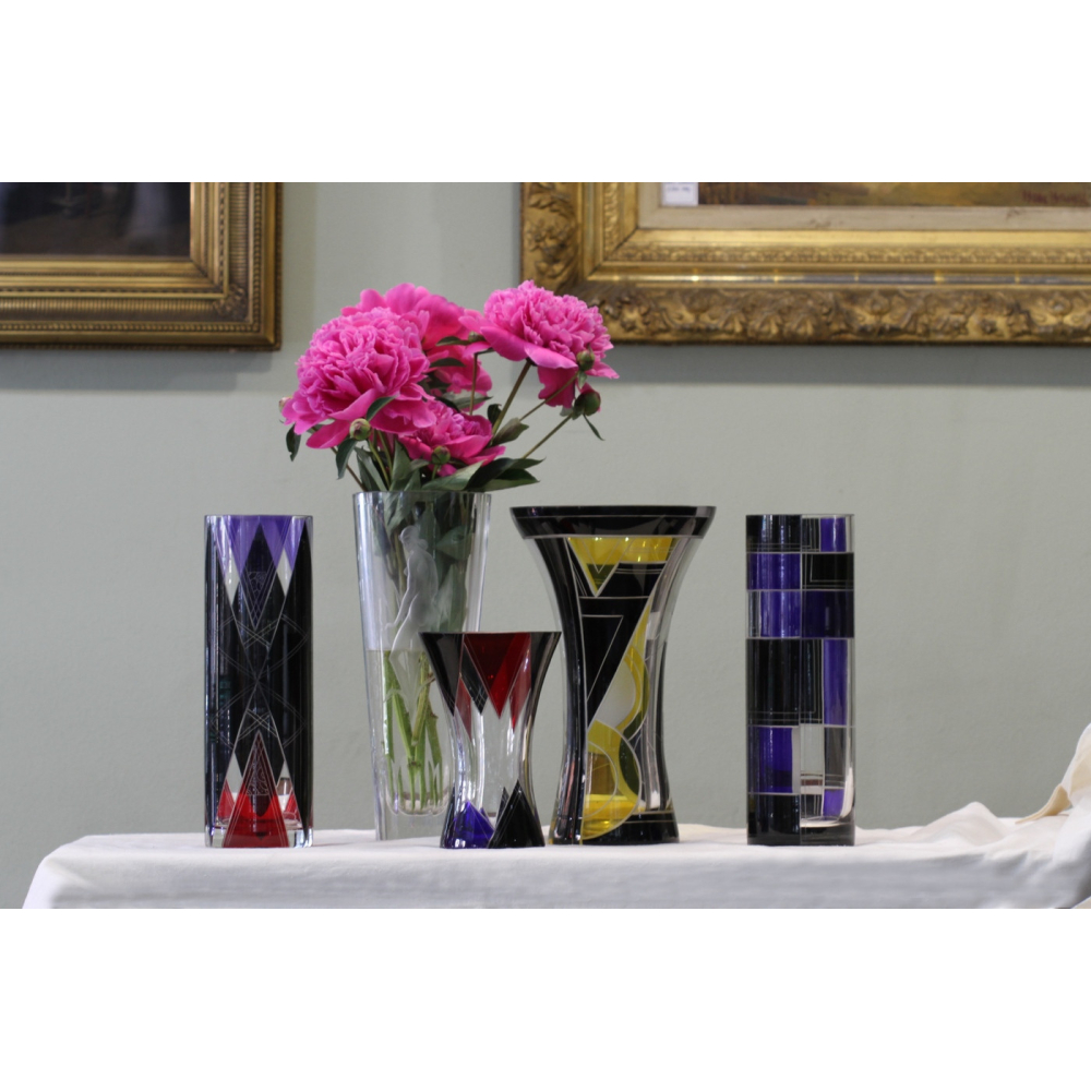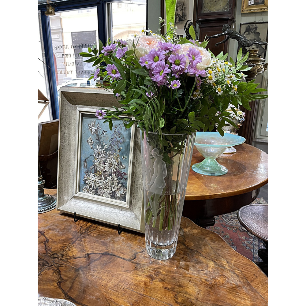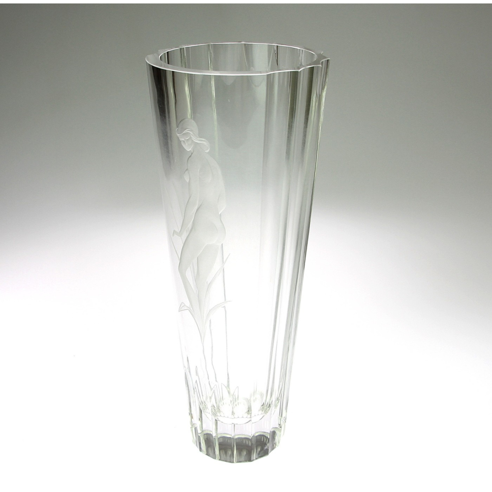 Large vase made of clear thick-walled glass. The vase is interestingly concave and convex in a vertical direction and is carved on the front side with an engraving of a girl's nude, a nymph in the reed. Signed "L.J.Gr."
