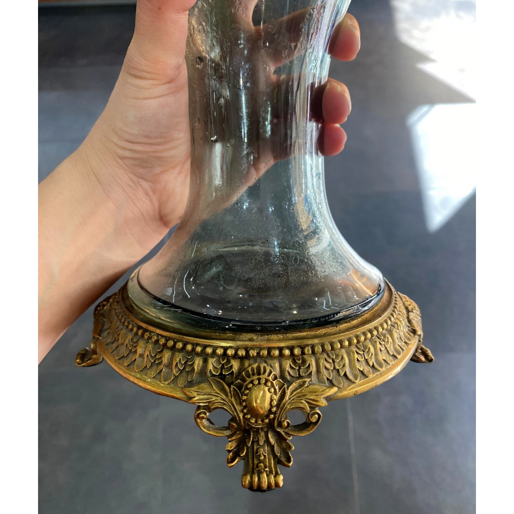 A tall vase made in France at the end of the 19th century from clear glass with blue layer. The outer cover is decorated with ornamental cobalt painting and gilding. Both the ear, the base and the neck of the container are protected and at the same time decorated with a gilded brass assembly.