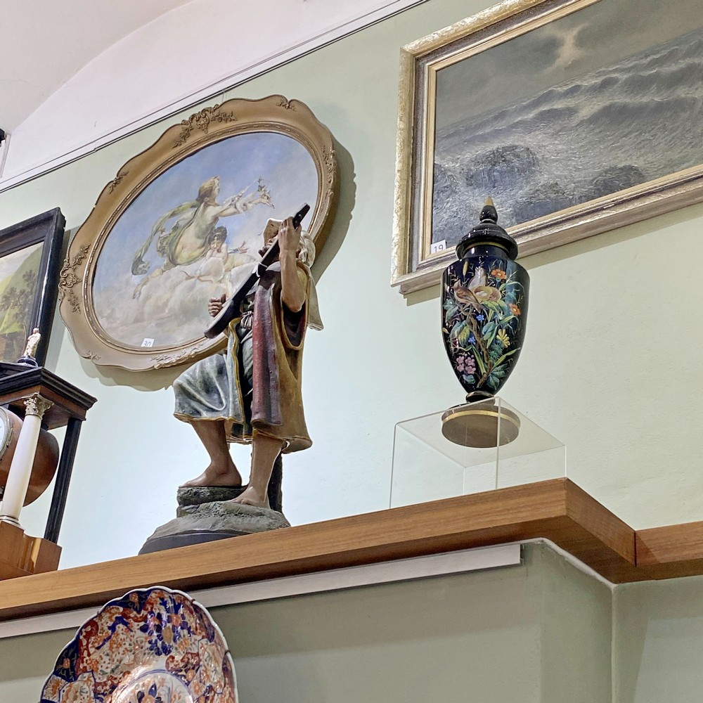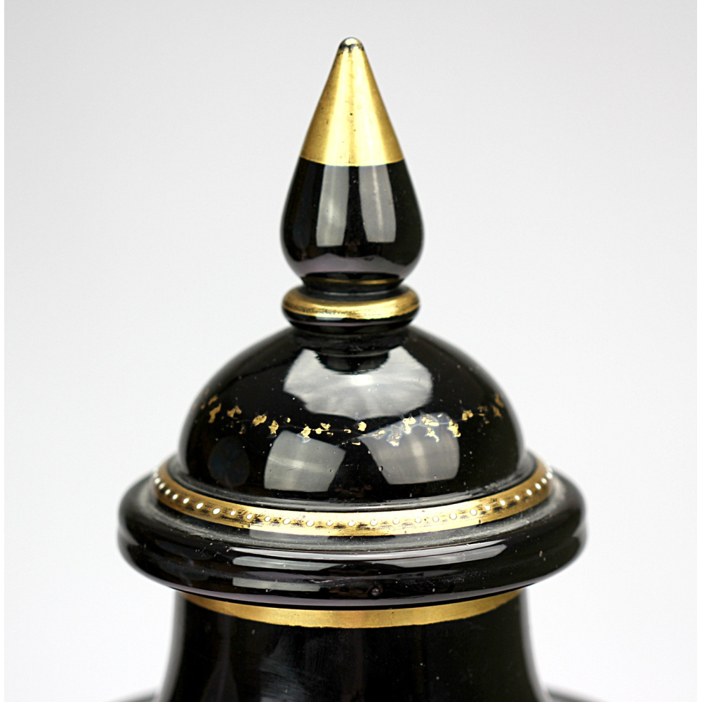 Vase on a leg with a lid made of black hyalite glass shaped in a mold. Decorated with colorful enamel painting of birds and a gold line. Made in Harrach (Harrachov) in the 1870s in the Neo-Renaissance style.