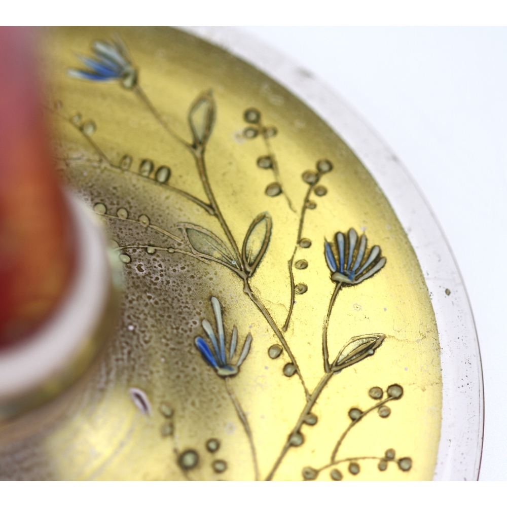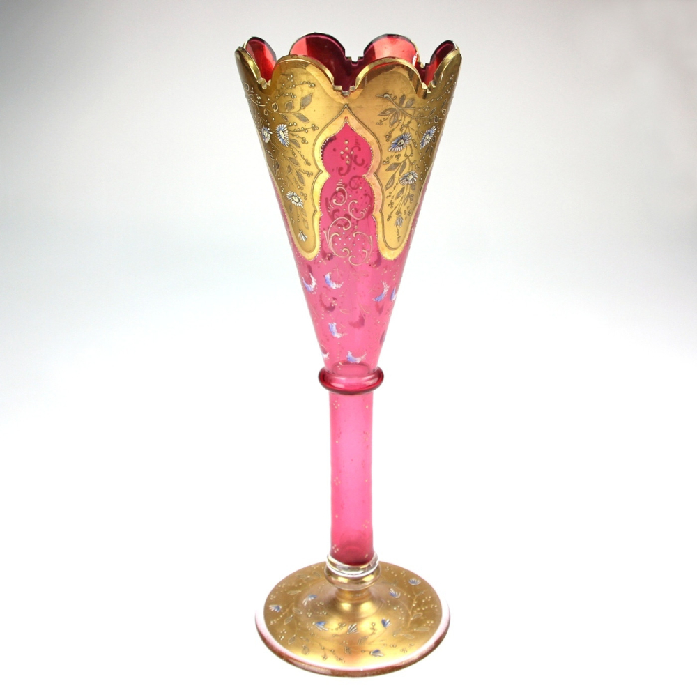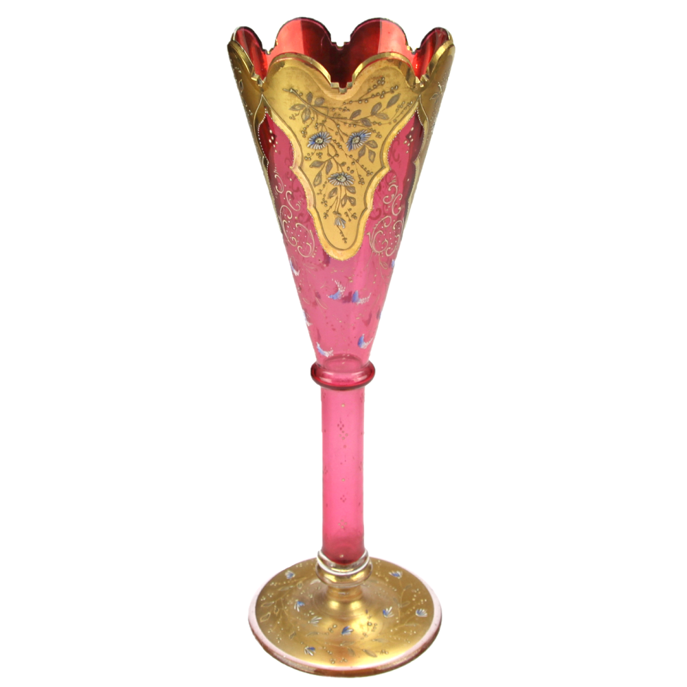 Vase made of colorless glass, which is covered with pink rosaline glass. The vase is further decorated with hand-painted white and blue enamels, and also with matte and polished gold.