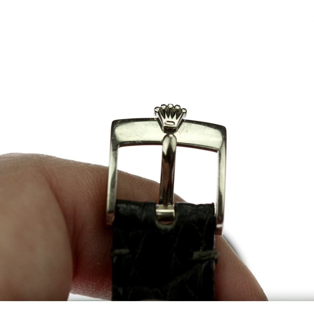 Women's wrist watch by the world-famous Rolex company, model Cellini Classic 6110 made of white 18k gold with black dial, sapphire glass and original leather strap.